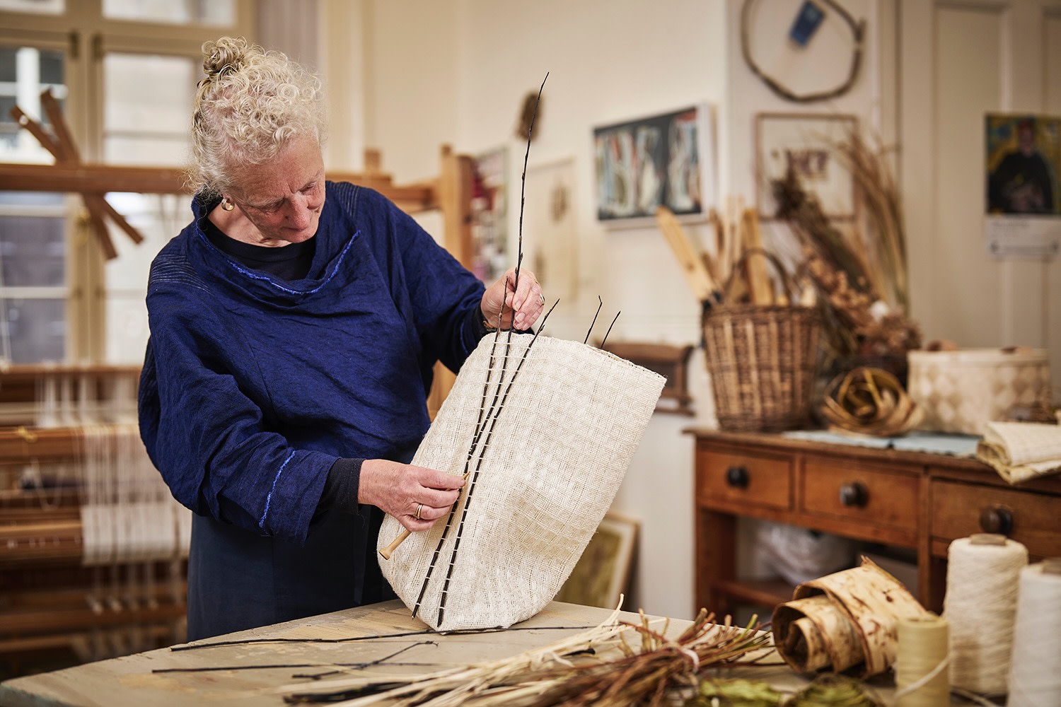 Susan’s journey into textile weaving began with the gift of a traditional 8-shaft floor loom. Prior to setting up her textile studio in 2016, she had been a clinician and academic in the field of public health. An ardent enthusiast and collector of textiles for some time, the gift of the loom inspired Susie to seek education in the processes and techniques of weaving. Today, she weaves full time for interiors, homeware, sculptural works and wearable pieces. As well as growing her own willow, Susie grows flax, which she processes and spins into linen. In her own words she describes her practice as: ‘exploring connections and synergies between loom woven cloth, and other natural fibres such as paper and home grown willow. The work speaks of a personal narrative about growing, harvesting, processing and making, with the maker as a constituent part of an ecological cycle.’